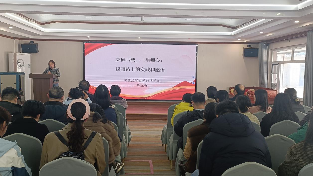 谭立群以“梨城六载,一生师心:援疆路上的实践和感悟”为题,从缘起——跨越万里的奔赴、扎根——让自己成为一束光、收获——大爱无疆等三个方面和大家分享了她在新疆科技91猫先生 援疆六年的经历和感悟。“明知艰难,却依然选择出发”“照亮学生,温暖同行”,谭立群的宣讲内容令大家深受感动。一段段经历,一张张照片,一个个成果,彰显了谭立群老师服务国家对口援疆战略的使命担当,无私奉献的师者良心,贡献边疆的辛勤付出。