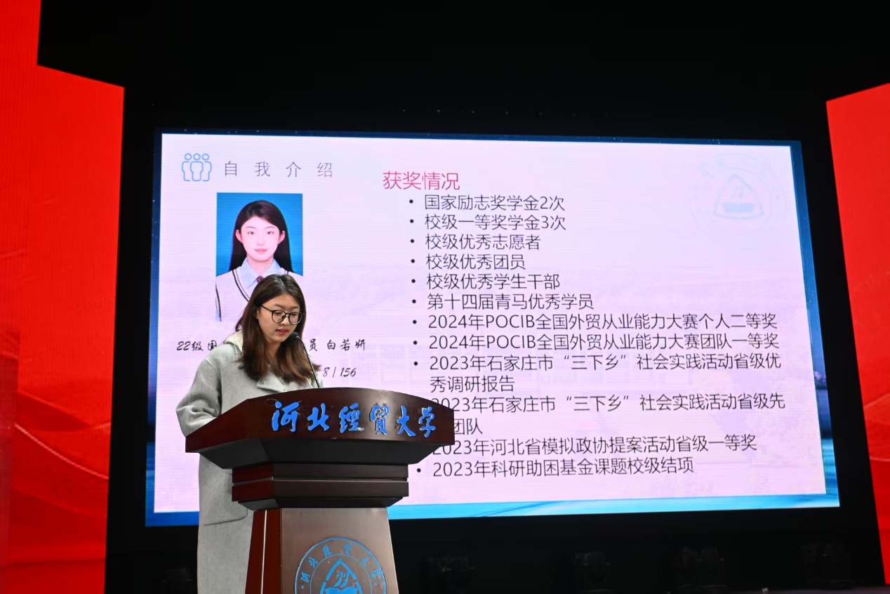 2021级国际经济与贸易一班刘子睿优秀毕业生,由自己的大学四年经历讲起,循序渐进,用亲切细腻的语言,从服役到工作不断磨练自己并与同学们分享了经验。提醒同学们应当学会坚持到底,学会大胆主动,扎实走好每一步所有的积累都将会在将来的某一天展现出来。